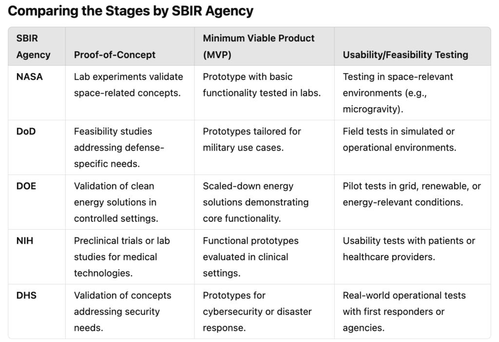 At the PoC stage, the goal is validation. You’re proving that your idea works—at least in theory. For SBIR Phase I proposals, this often involves lab-based research, theoretical modeling, or small-scale experiments. Each agency approaches PoC differently: